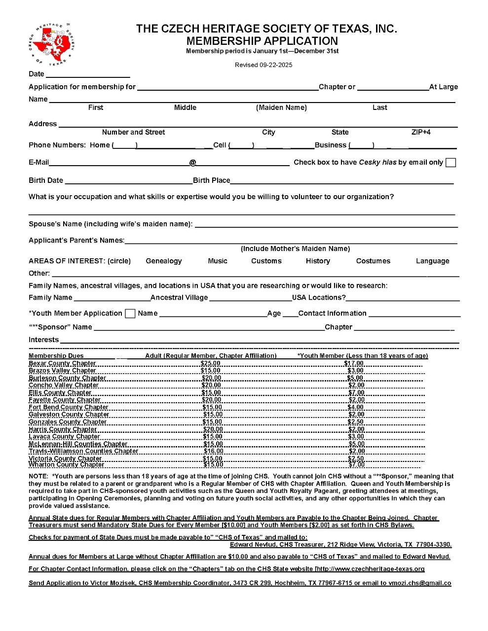 Annual dues are $15 for adults and $3 for youth [any person under the age of 18 at the time of application]. Every youth must have a parent or grandparent who is an adult member of CHS for the youth to become a member. The membership application form has a place for youth membership.
